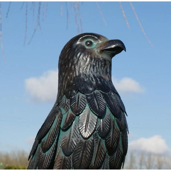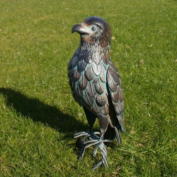 Deze arend in metaal waakt over de tuin maar kan ook in de huiskamer zijn plaats veroveren. Het beeld is afgewerkt met een bronzen patine en is mooi en origineel vormgegeven.